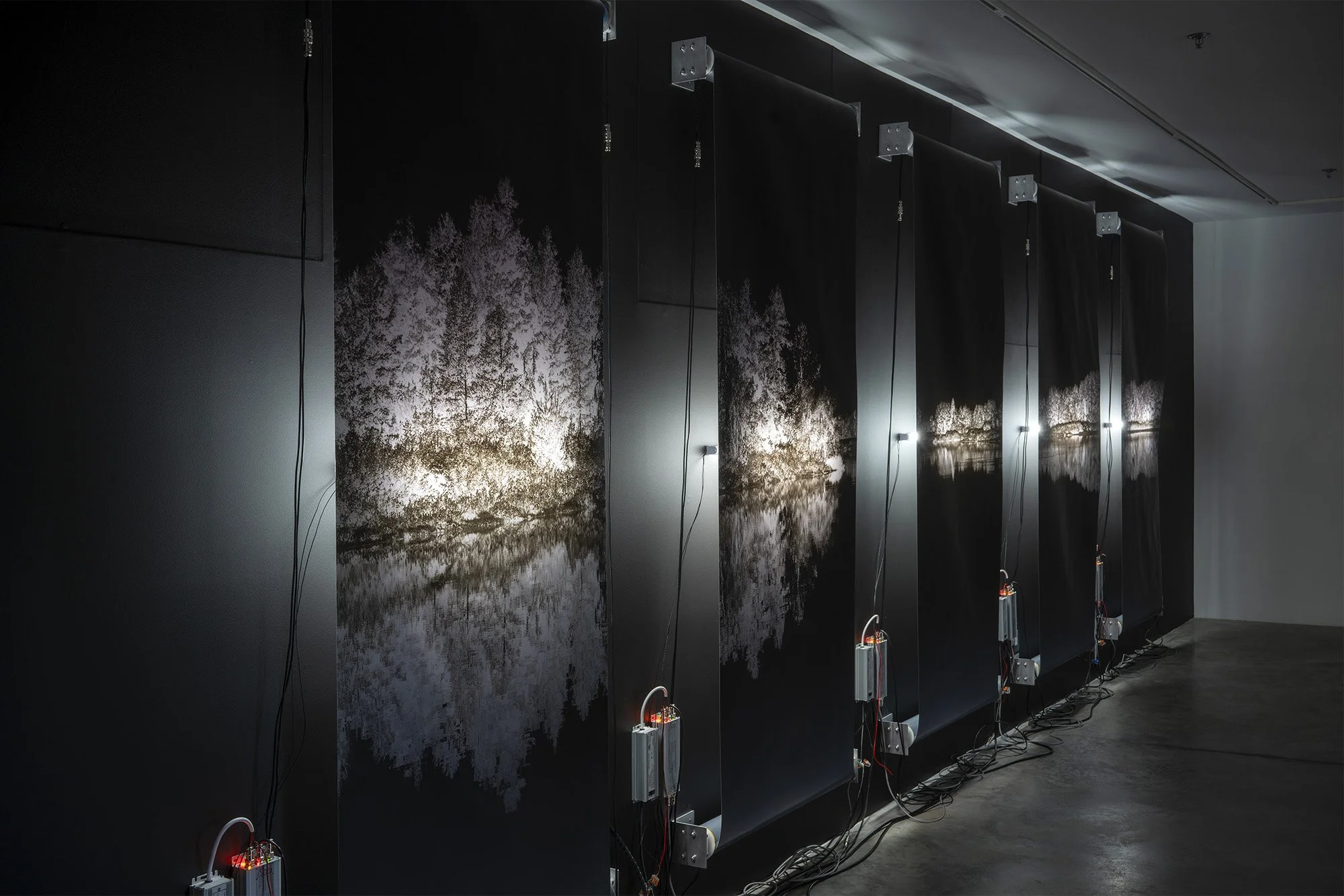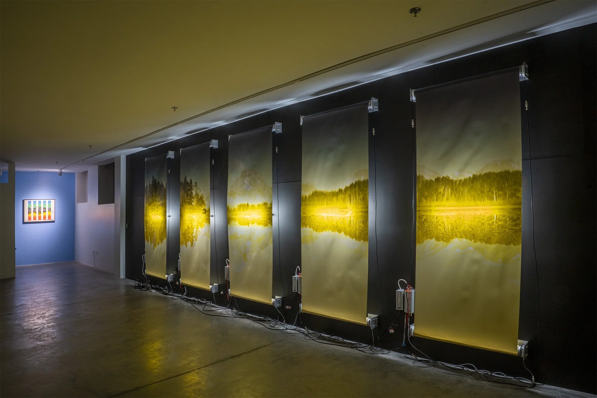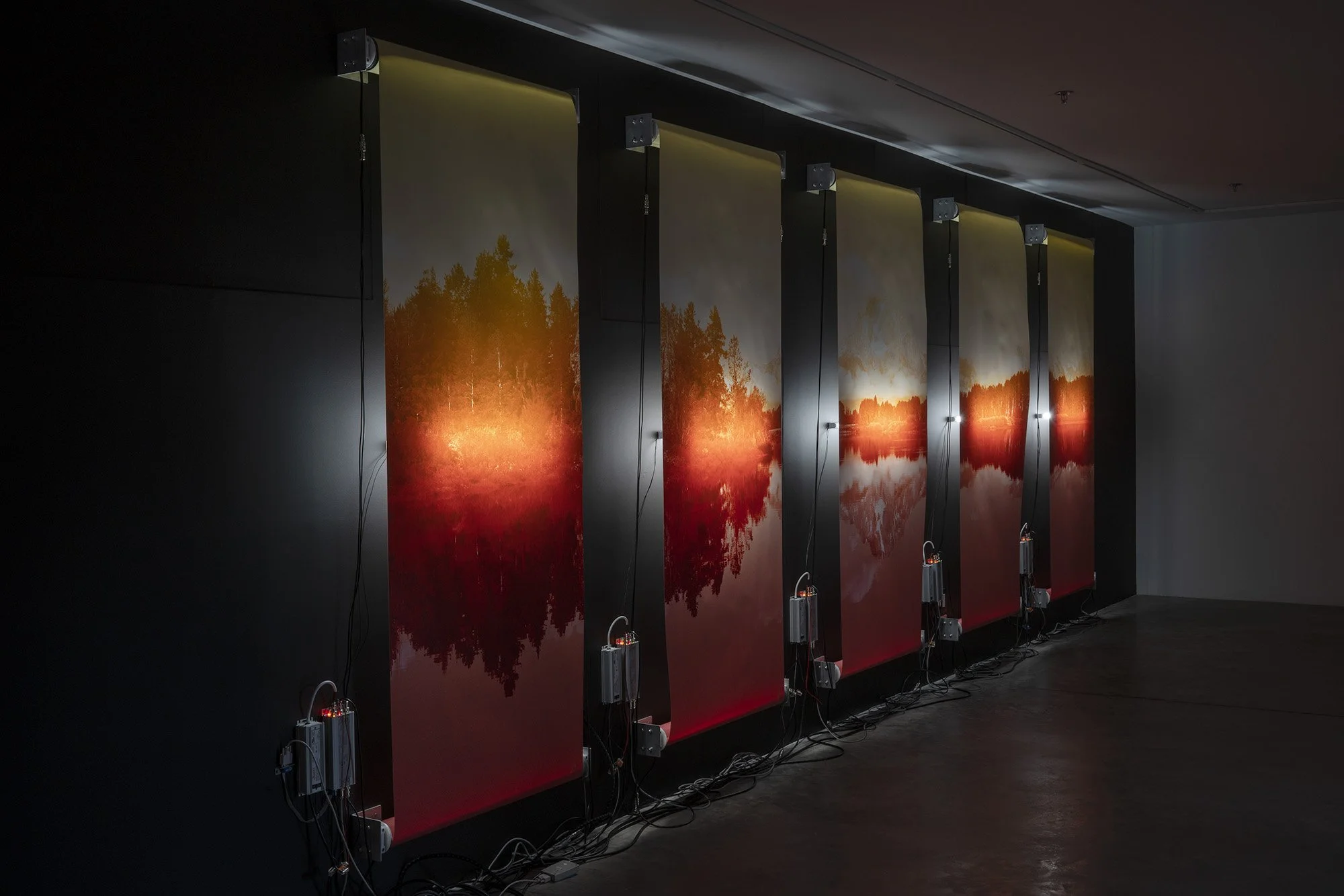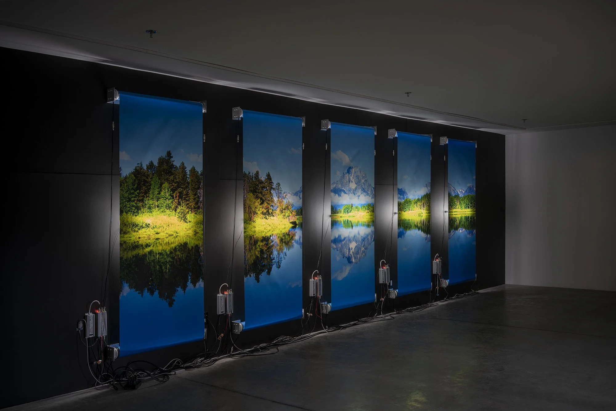 This new body of work leans heavily into this concept of likeness, as his chosen image depicts a mountain and its reflection in the clear stillness of a river. But unlike anything Baclawski has presented before, this time, instead of a single static image portrayed through lightbulbs, the image itself moves. The five sections, comprising one image, are divided and presented on a scrolling mechanism that the artist has mounted directly onto the gallery wall. As the image scrolls, it morphs from a seemingly idyllic landscape picture to the negative in an almost apocalyptic red at the end. The scroll waves slightly, mimicking the bend and movement of Snake River, which winds through the National Park for 50 miles.