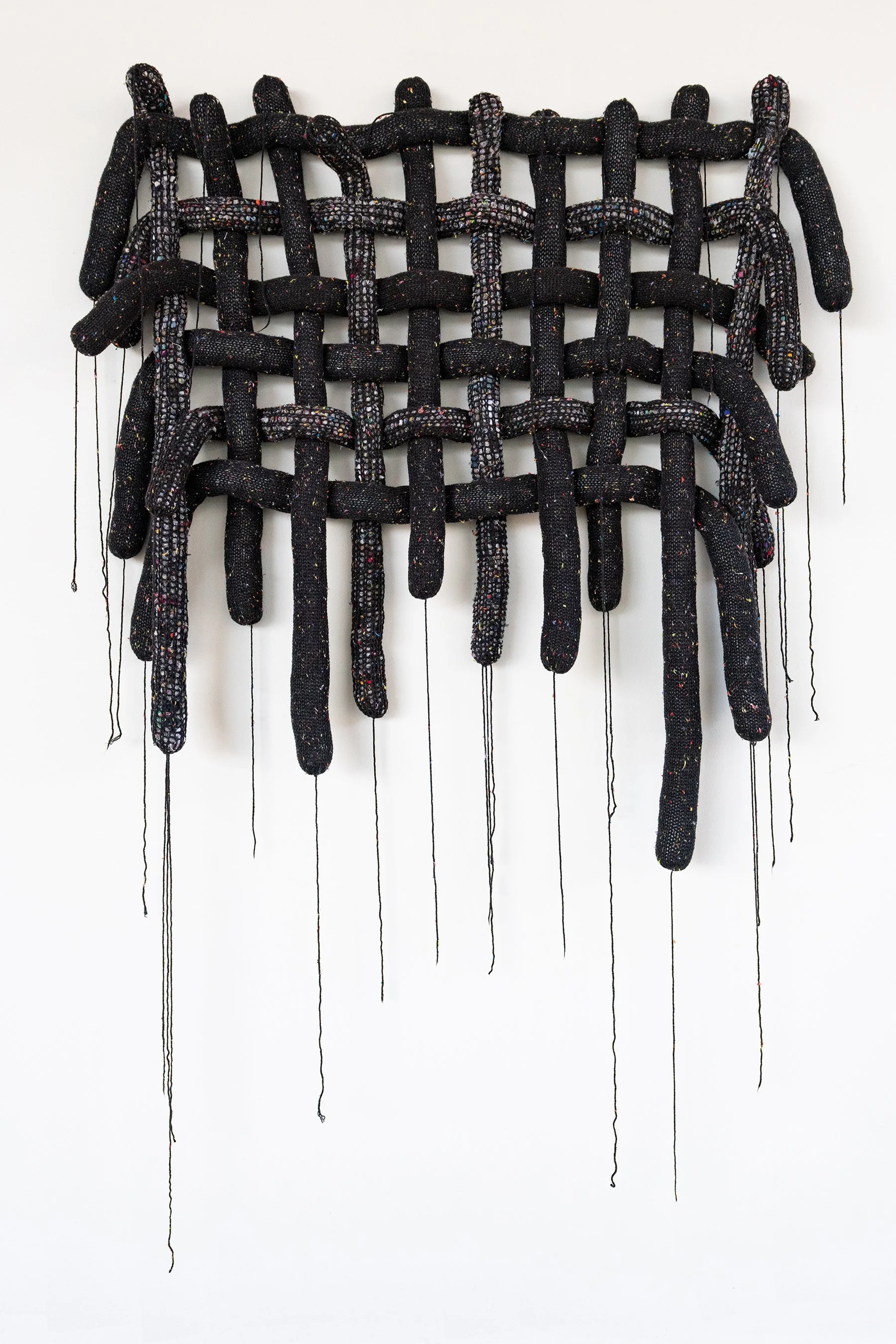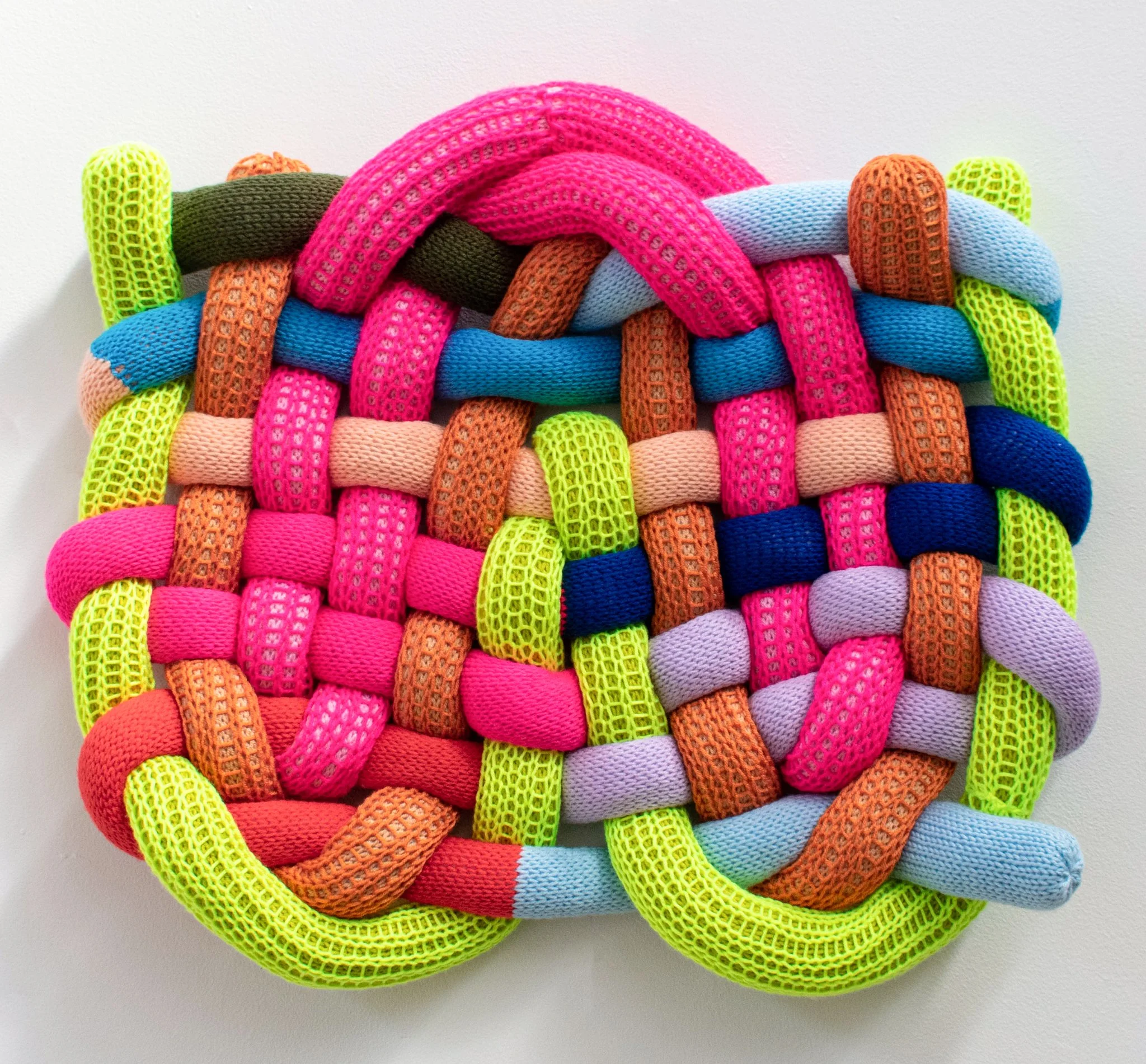 “I began exploring the labor-intensive and meditative process of darning in the interest of mending my partners’ tattered and well loved jeans. Since then I’ve continued mended clothing for others. My hands move through the fabric, weaving thread over and under to rebuild. The wonderful textures created through mending are what influenced me to create giant magnified versions. Increasing the scale of the thread to that of large, stuffed knitted tubes, created a new way to explore shape with linear forms. Weaving these elements under and over allows the space inbetween to amplify the round plushness and texture of the work. Evoking a desire to touch and play, the familiarity of these textile forms brings a collective sense of intimacy, warmth, and joyfulness.” - Katrina Sánchez